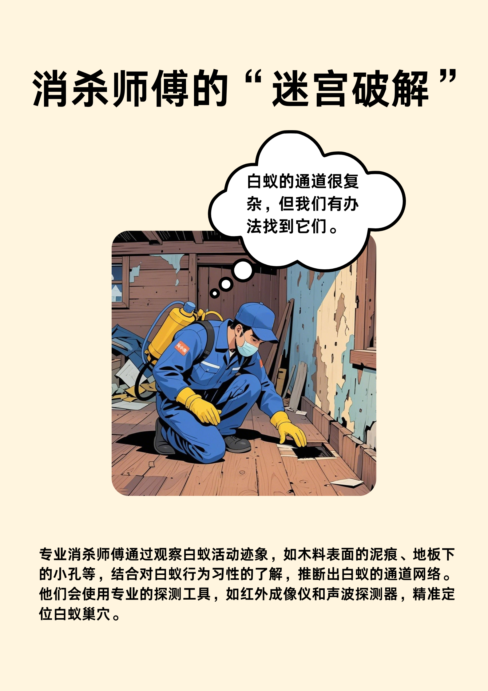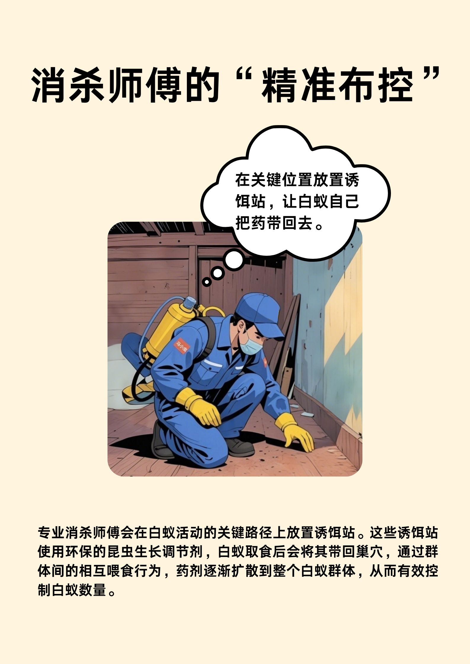 专业消杀师傅凭借丰富经验,观察白蚁活动迹象,像木料表面泥痕、地板下小孔等,结合对白蚁习性的了解,推断通道网络布局。借助红外成像仪、声波探测器等专业工具精准定位巢穴。他们会巧妙地在白蚁活动关键路径放置诱饵站,内含环保昆虫生长调节剂。白蚁取食后带回巢穴,凭借群体交哺行为,药剂扩散至整个群体。昆虫生长调节剂抑制白蚁几丁质合成,使其蜕皮失败,最终引发群体崩溃。