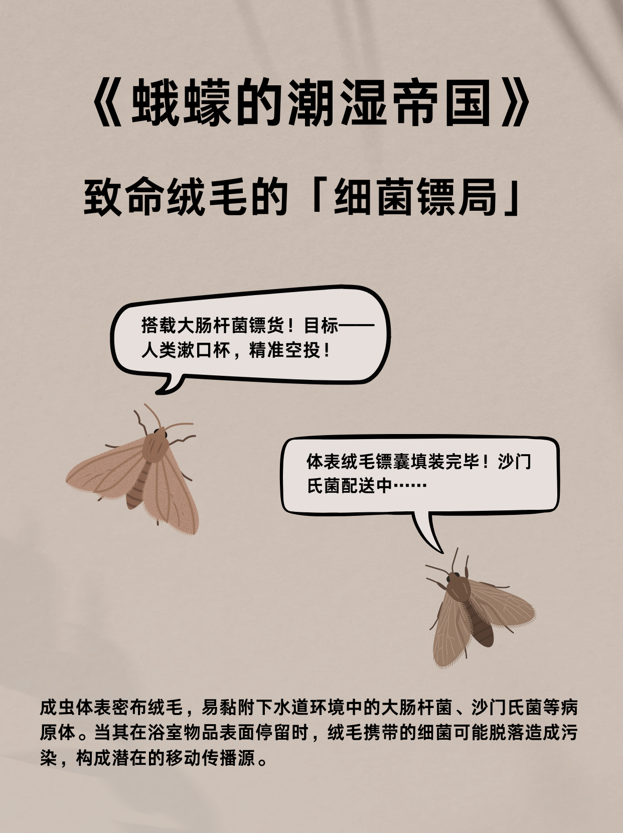 成虫体表密集的绒毛易黏附大肠杆菌、沙门氏菌等病原体,当它们停留在牙刷、毛巾等物品表面时,携带的细菌可能脱落造成污染,成为浴室环境中潜在的健康风险源。
