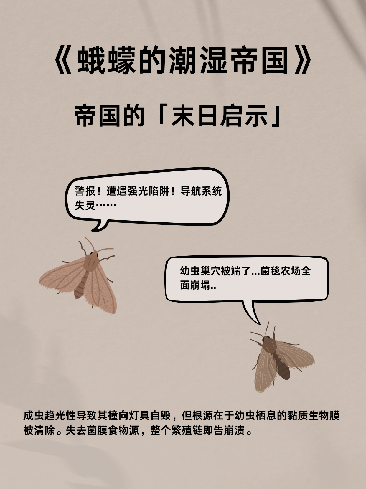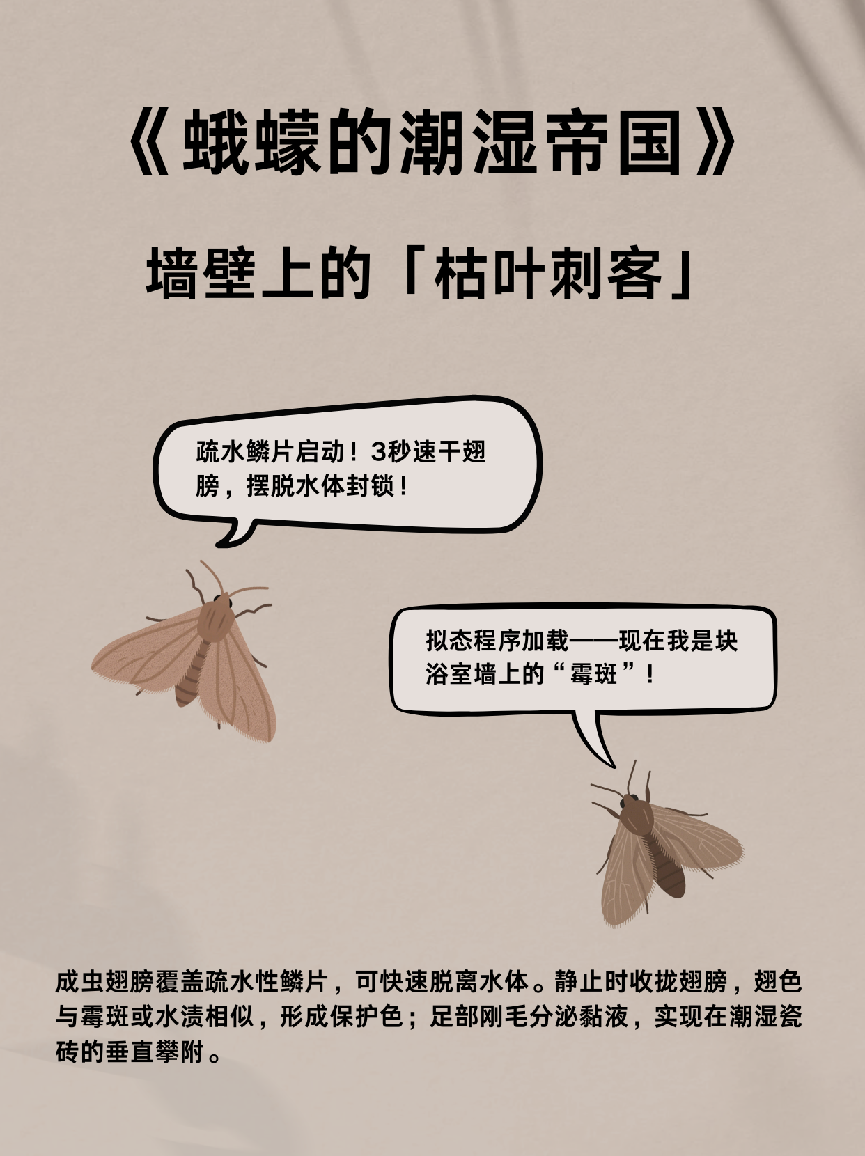 羽化后的蛾蠓具备更强的环境适应性:翅膀的疏水性鳞片可实现快速干燥,助其脱离水体束缚;静止时翅色与霉斑高度相似,形成保护色伪装;足部刚毛分泌的黏液让它们能垂直攀附瓷砖,在潮湿墙面上自由活动。
