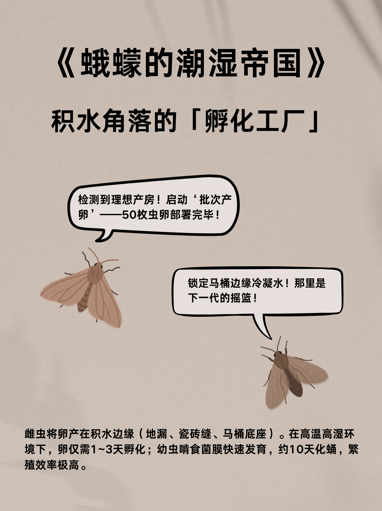 雌蛾蠓将卵产在积水边缘(地漏、马桶底座等),在高温高湿条件下1~3天即可孵化。幼虫以生物膜为食快速发育,约 10 天完成化蛹,短周期繁殖使其能在潮湿环境中迅速扩张种群。