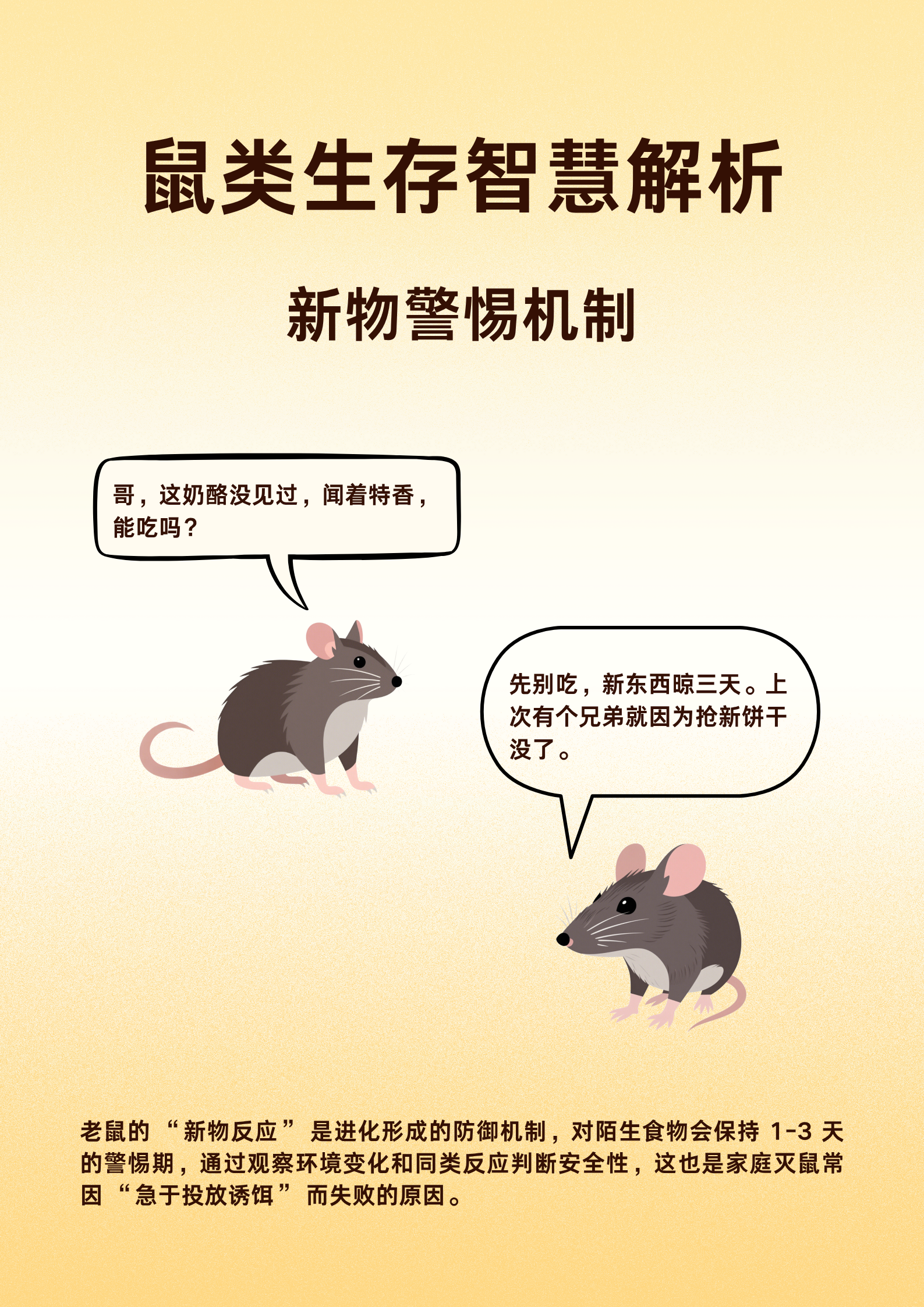 老鼠的 “新物反应” 是进化形成的重要防御机制。当面对陌生食物时,它们会保持 1-3 天的警惕期。在此期间,老鼠会通过观察环境变化以及同类的反应来判断食物的安全性。这一机制也解释了为何家庭灭鼠常常因 “急于投放诱饵” 而失败,因为老鼠对新出现的诱饵会本能地保持警惕,不会轻易取食。