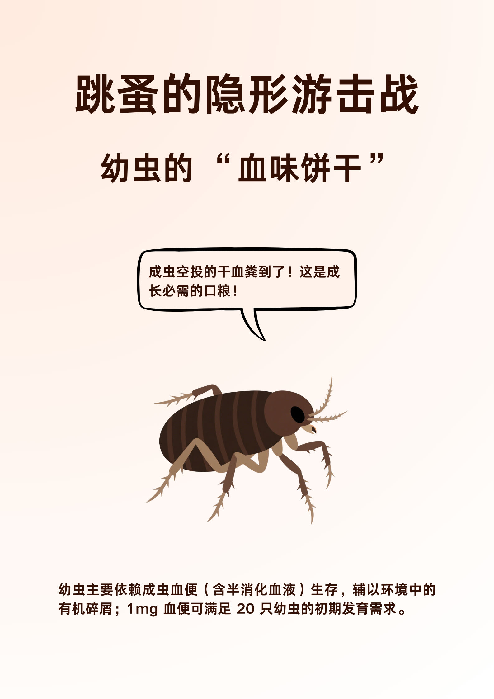 跳蚤幼虫的生存则完全依赖成虫的血便。幼虫无法直接吸血,成虫排泄的含血粪便为它们提供了生长所需的全部营养,少量血便就能满足多只幼虫的生长需求。