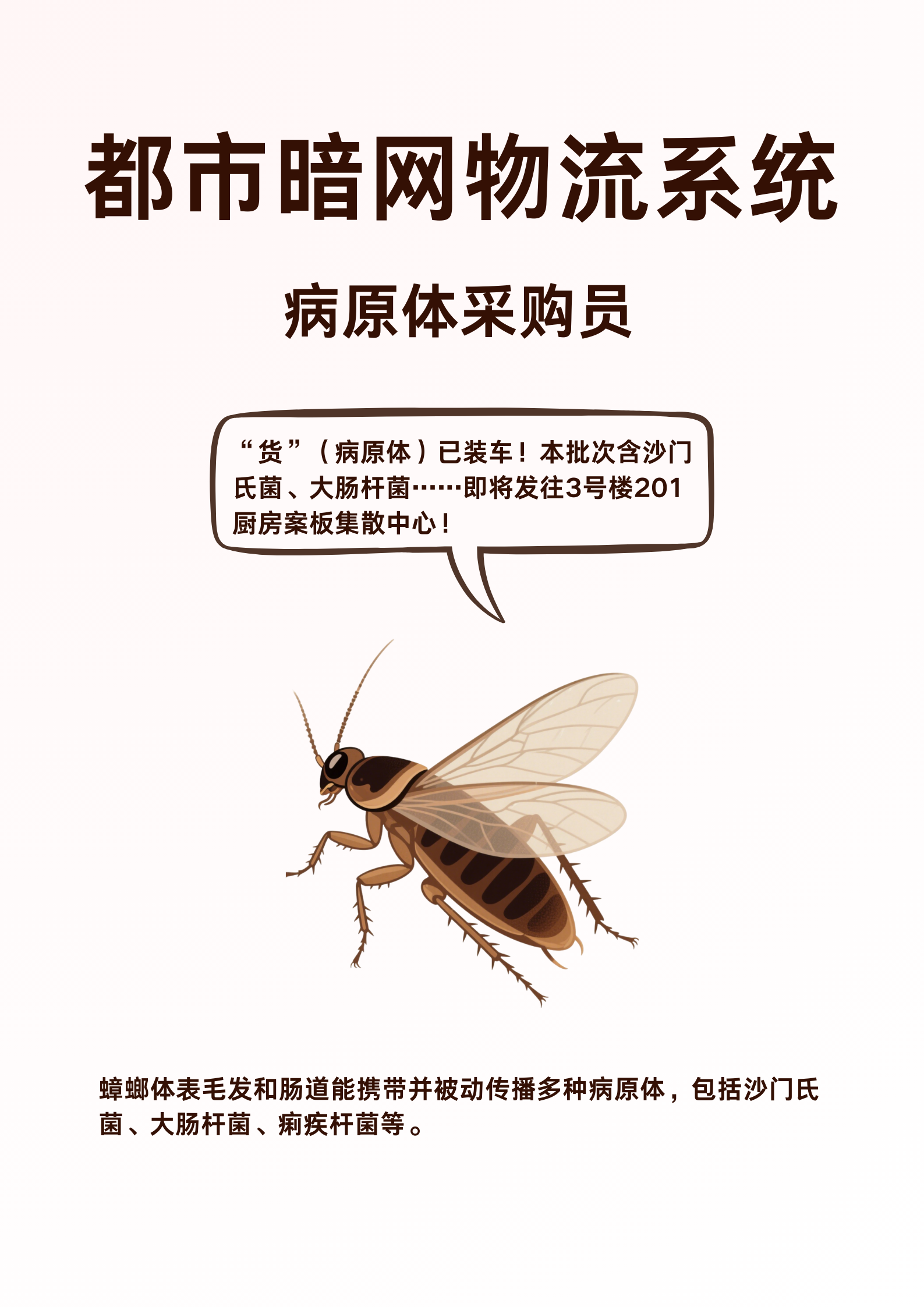 系统中流通的 “货物” 分两类:病原体与过敏原。蟑螂体表有细毛、肠道可留存微生物,是天然病原体载体。它们从下水道爬出,“装载” 沙门氏菌、大肠杆菌、痢疾杆菌等,沿信息素路径将病原体送到厨房案板、餐具等 “集散中心”,成为诱发肠胃疾病的重要媒介。